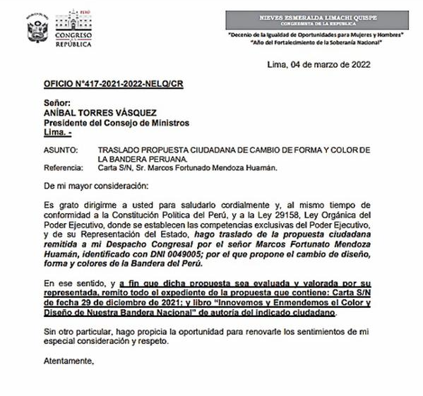 La iniciativa es del ciudadano Marco Mendoza Huamán basado en su libro “Innovemos y enmendemos el color y diseño de nuestra bandera nacional” y lo presentó a la legisladora el 29 de diciembre del 2021.